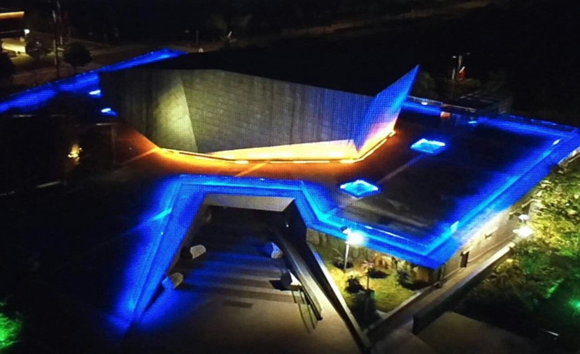 幸福館以羌族所崇拜的白石為主題。護欄中嵌入的線條燈采用密集小功率燈珠和小角度透鏡,透過玻璃圍欄照射到下方不銹鋼底座上,線條燈反射出藍寶石的效果,達到見光不見燈的效果。同時在原有藍寶石造型的玻璃天臺中加入特定波長的藍色光源,讓出光效果更為接近寶石藍,成為幸福館的一大亮點。
