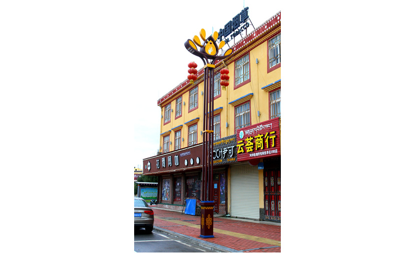 安裝在S209線的“犇牛”燈以高山高寒地區(qū)特有的珍稀牦牛為設(shè)計元素,牦牛被藏族人民稱為“高原之舟”。設(shè)計者通過燈型主體將牛頭牛角外部輪廓展現(xiàn)出來,塑造了一個栩栩如生、富有力量感和氣勢磅礴的犇牛形象。燈桿中部燈箱絲印臧八寶圖案,內(nèi)置LED光源,愿當(dāng)?shù)孛癖娂槌T冢鞂俸湍溃笕缭浮?