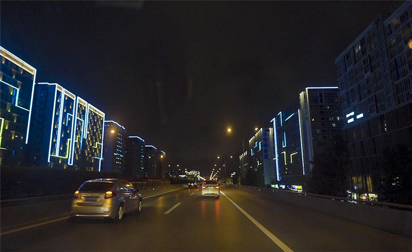 目光來到機(jī)場(chǎng)高速沿線,當(dāng)乘車飛馳在機(jī)場(chǎng)高速上時(shí),旅客可以欣賞到兩邊的建筑樓宇夜景。投光燈在展現(xiàn)建筑夜間結(jié)構(gòu)美的同時(shí),樓宇上的動(dòng)感氛圍燈通過變化慢慢向前延伸和追逐,光影的流動(dòng)體現(xiàn)的是成都的律動(dòng)。
