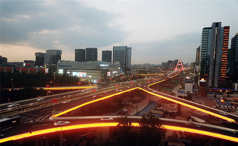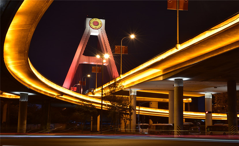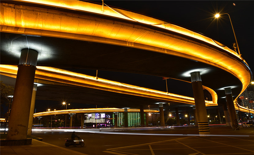 橋側和橋腹,分別通過線型投光燈和線型洗墻燈照亮的方式,采用連續暖色調的有色光以表現立交橋夜間的建筑美,使立交顯得更輕盈。