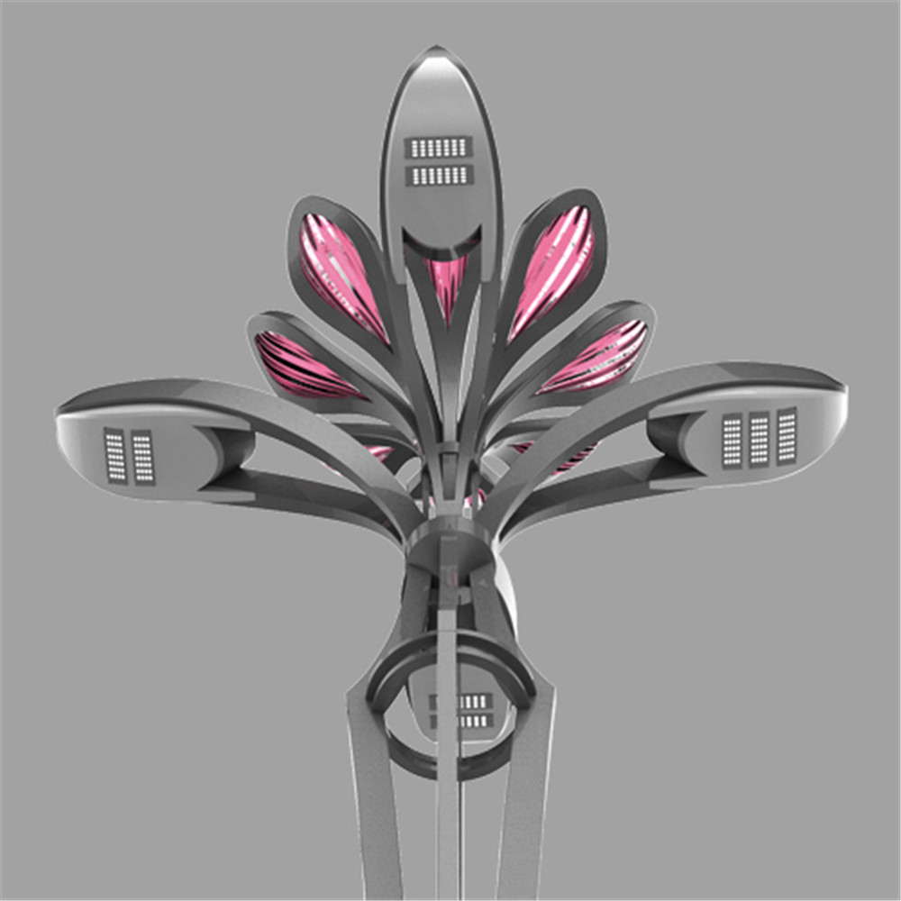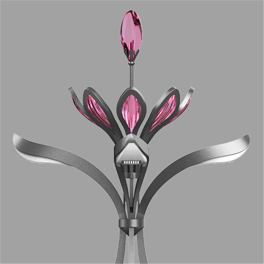 采用山茶花作為設計元素,燈桿設計成四桿花瓶狀,打破常規燈桿單一的樣式,主體分為功能照明和裝飾照明兩個部分,分別對應的是山茶花的葉子、花瓣和花蕾,彩色的裝飾玻罩白天具備一定景觀性,和道路綠化景觀的“四季有花賞”的設計策略相融合,夜晚呈現山茶花盛世開放的亮麗景致。