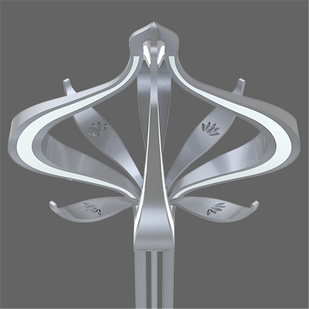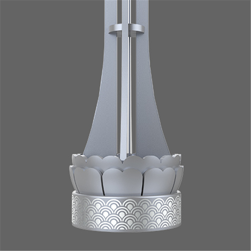 現代的蓮花抽象成佛教金剛杵的形態(tài),內斂棚合的造型是雙手合十的禪意,前衛(wèi)而充滿佛性,精致脫俗的蓮花水紋底座詮釋蓮花的出淤泥而不染;